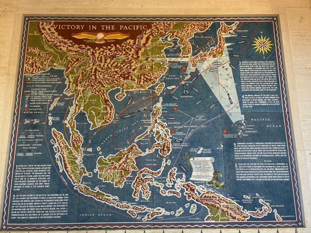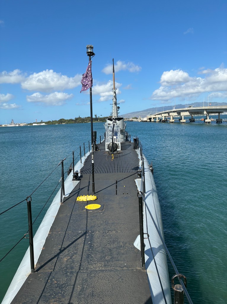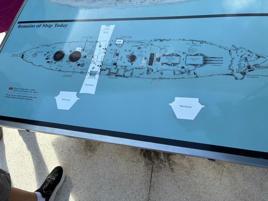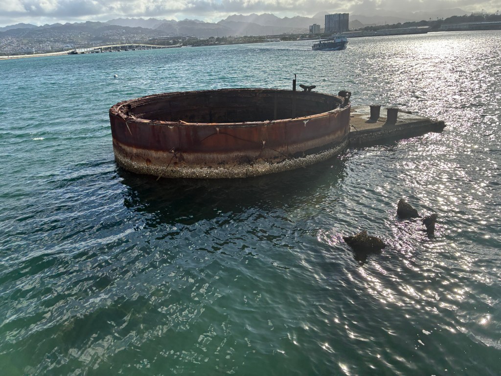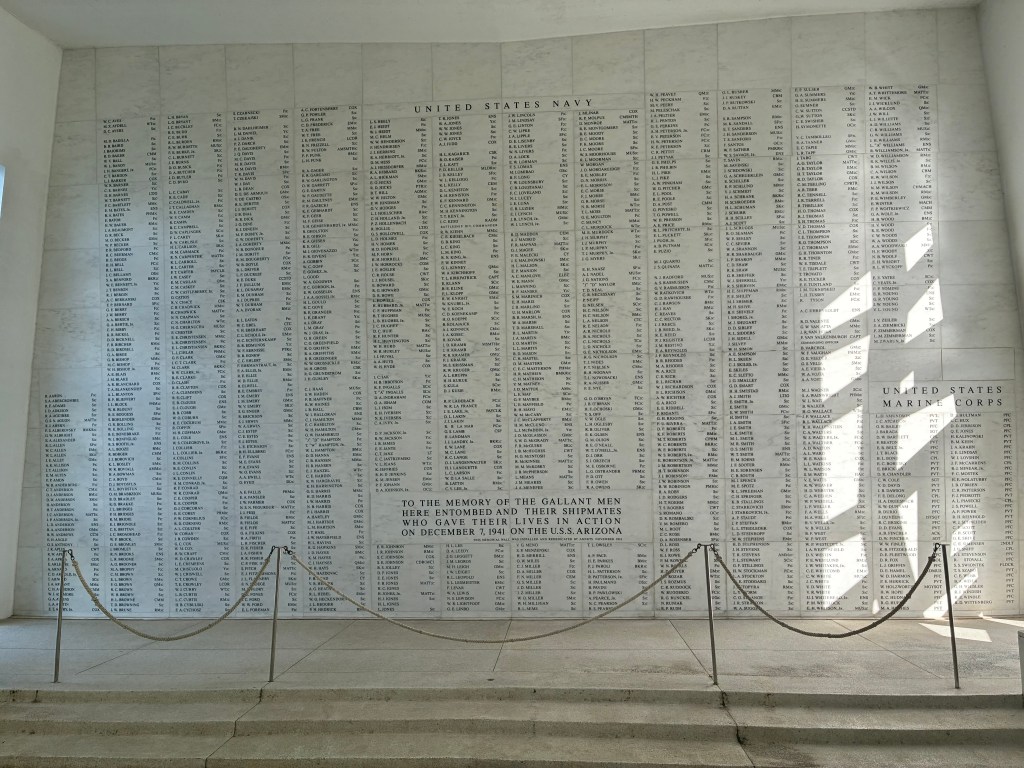 The boat ride was manned by people in uniform. It was only about 10-15 minutes. We got off the boat and went straight back to the wall of names. There a volunteer told us again about the brothers and pointed out some names on the wall. She also told the story about how 45 of the surviving men requested to be interred with their comrades. The men needed to be cremated and put in a waterproof urn. The family would take the boat over to the memorial, have a service, then the navy divers would take the urn into the ocean, they would hold it up as Taps was played and the family could say their last goodbyes, then they would dive under and place the urn near the gun turret. All of the men who served on the USS Arizona have passed away and the last man interred there was in 2021. I thought it sounded like a beautiful ceremony.