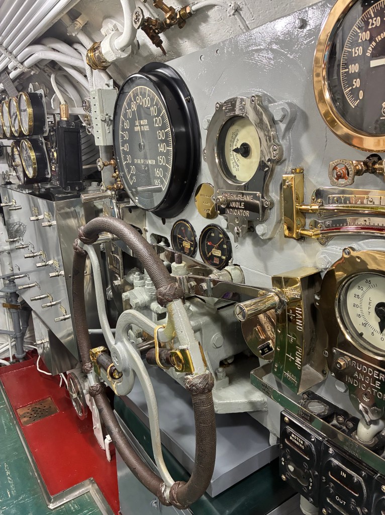 The control room is the next area. It’s amazing to me how well they have maintained this equipment. The sub was active in 1945. I took a picture of the Conning Tower, which is where the captain would be during battle stations. It has all the most important controls.