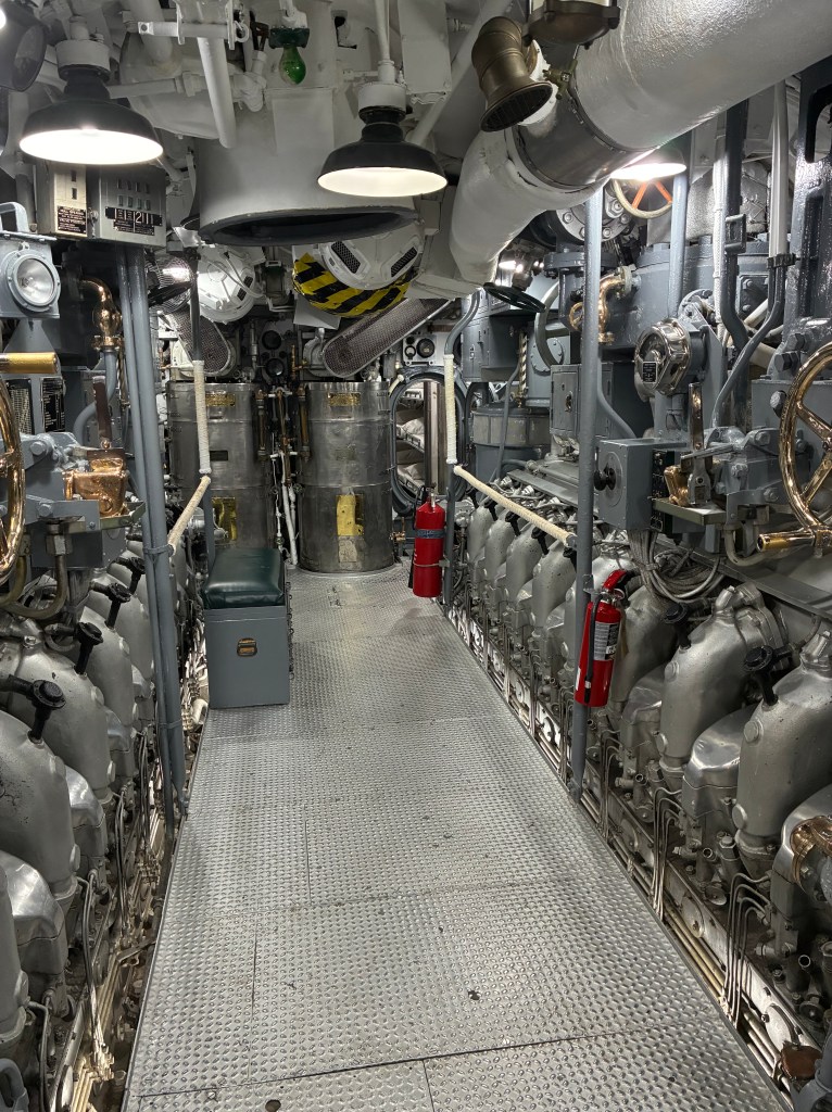 There are two engine compartments, one of which I have a picture, a maneuvering room and the aft torpedo room, which looks very similar to the forward torpedo room. The sub fought both above and below water, so you can see the guns on the topside of the submarine.