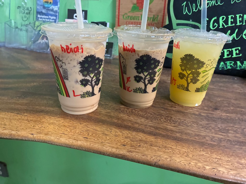 We traveled to the Green World Coffee Farm to get our daily coffee. I got an iced latte, my husband got a regular iced coffee and some freshly squeezed pineapple juice. They also had samples of other coffee they had for sale. I tried a couple and it was so flavorful that we bought beans to bring home.