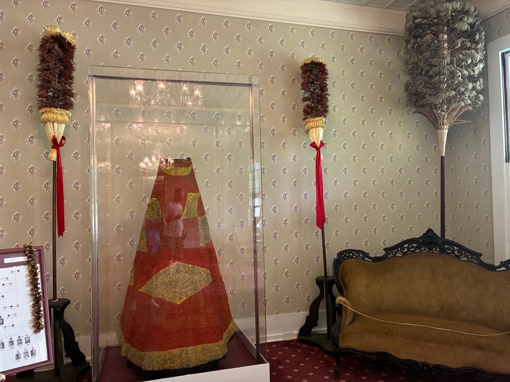 The house itself was a pretty basic set up to keep all the rooms cool. The furniture inside was actual pieces from the family made with wood from Hawaii. I also appreciated viewing all the feather decorations. The cape was made with feathers from birds that were not killed. They painstakingly captured and released birds after taking some feathers. I found that very impressive.