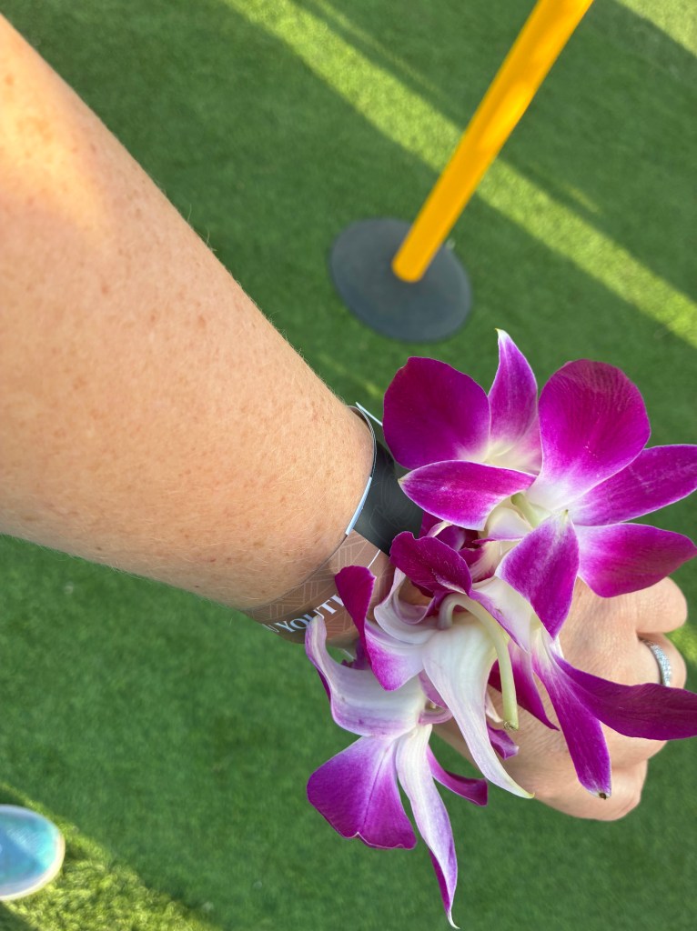 Our last event of the day was our first luau. It cost about $120 per person. We could have paid more which would have given us more drink coupons, a closer seat, and a different necklace, but we were happy with what we purchased. Our seats were in the “rear”, we received shell necklaces when we entered, and we each had a drink coupon. We entered the luau area at 5pm. They had a variety of activities for us to do before we even ate dinner.