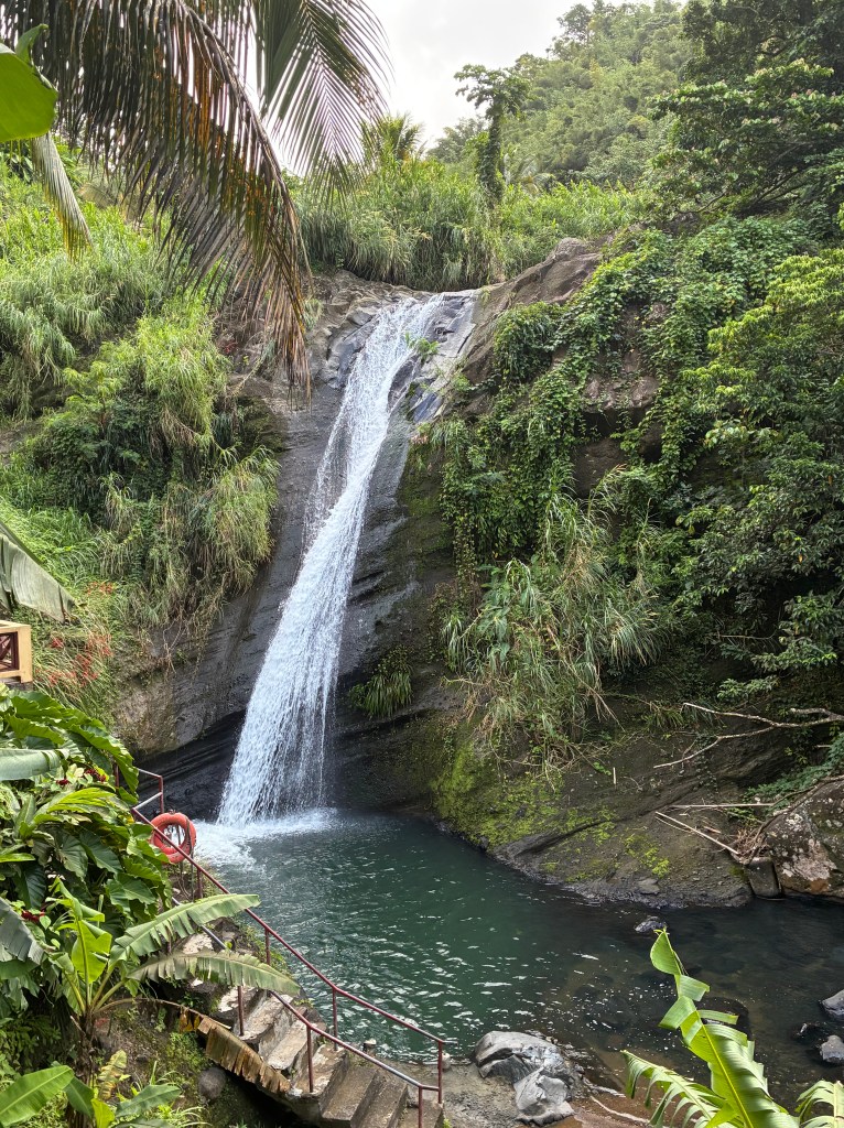 We drove through the city of Saint George (where we were docked) and it was so busy. There was a lot of traffic. As we got out of the city and traveled next to the coast it was much calmer. The views were beautiful. The road we took up to the waterfall was tiny and quite rough. They were working on it, though.