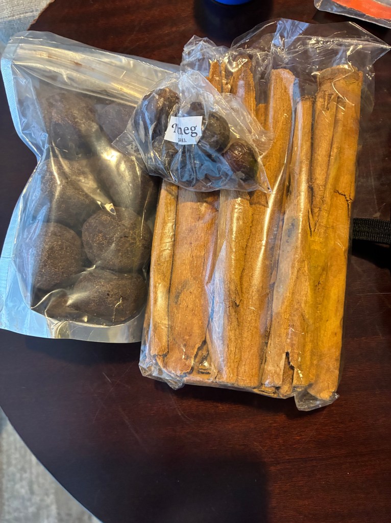 They had all kinds of different jams to taste as well as rum punch. One of the employees poured us a mini cup and it had a neat after taste of different spices. Grenada is well known for nutmeg. They also had local cinnamon, so I bought a bunch of sticks, and cocoa balls to make hot chocolate. She gave me the nutmeg for free. You have to crack it open and then grate it. All of it cost about $16.