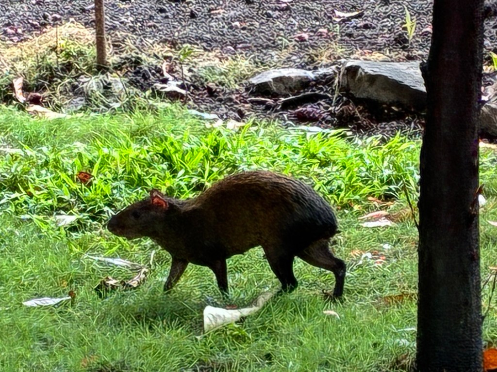 After breakfast we had a little bit of time before our bus to the airport, so we wandered the grounds a bit. My husband had done so earlier and saw some agoutis and I wanted to see them too. We saw a bunch. We also saw some orange and yellow birds. We did not go in the animal sanctuary because it was closed and we didn’t have time. I hope we can see it on our trip back from the islands.