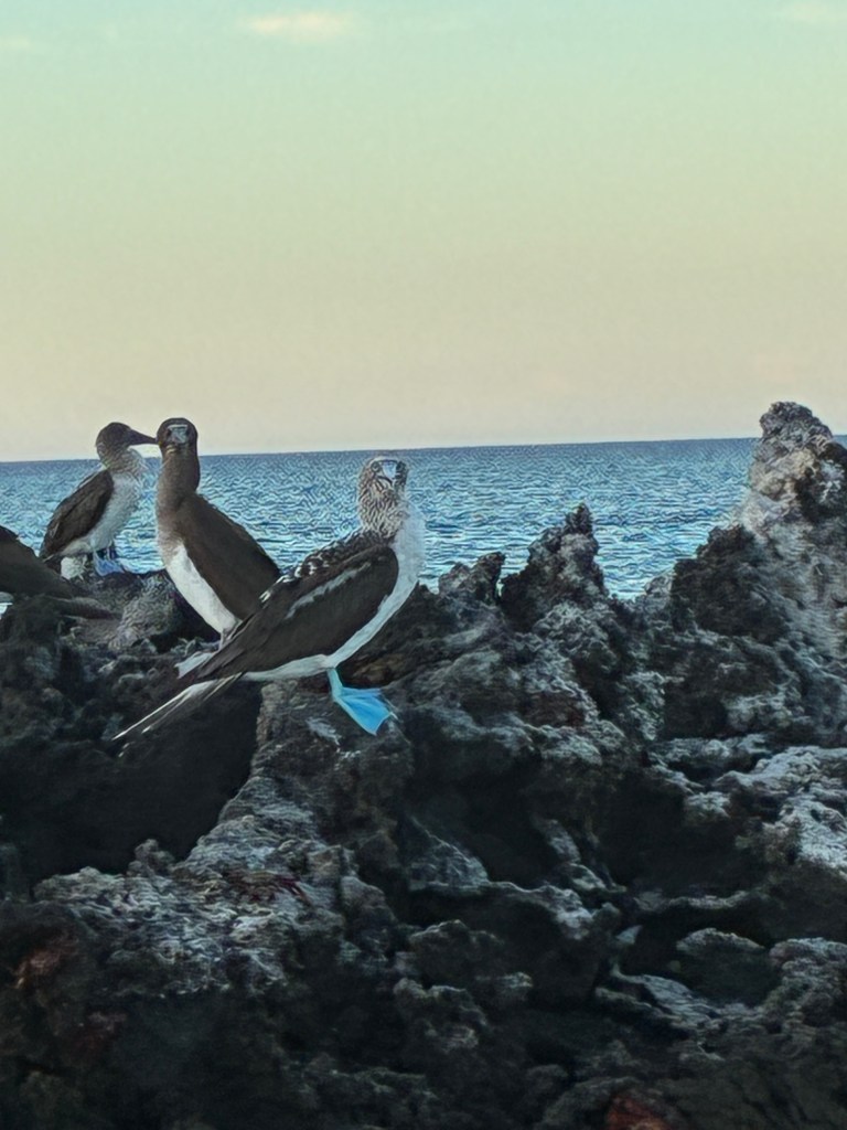 We were on a Zodiac with Tanya (the naturalist tour guide) and Horatio (the Zodiac driver). The first thing we saw were blue footed boobies! They were so cool. The pictures were not perfect because we took them into the sun.