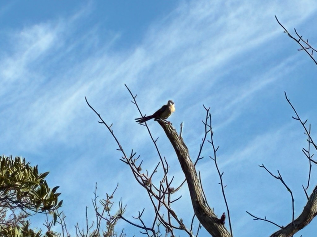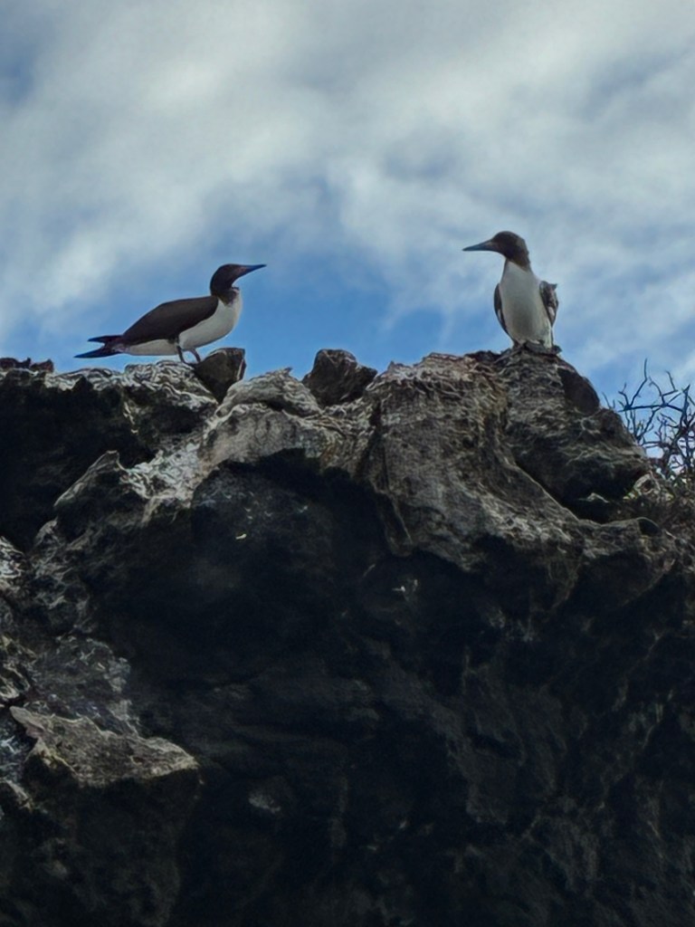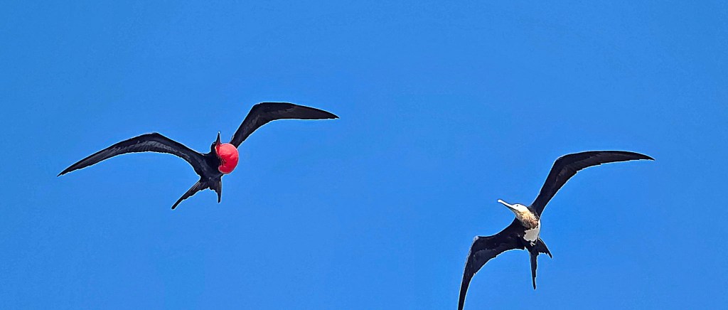 We were looking for the male frigates displaying their courtship tell, which looks like a red tomato on their neck area. It’s a patch of skin that they inflate. I saw pictures in which they were on the ground and it’s very impressive, but it was also pretty cool watching them fly by with it inflated.