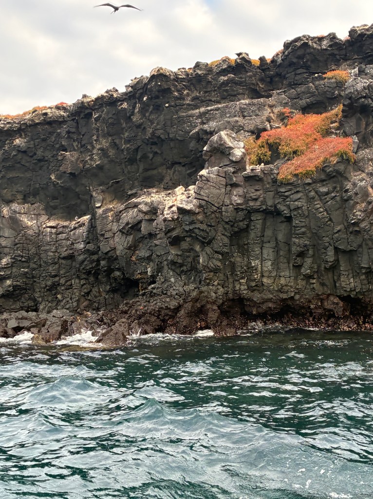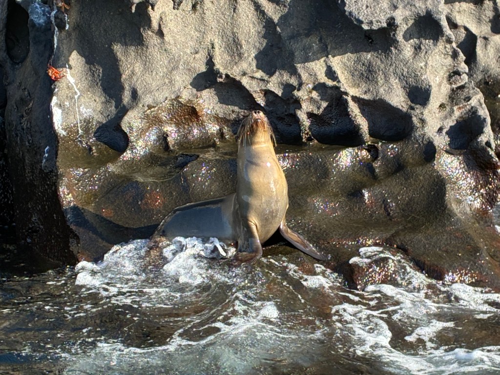 North Seymour is quite close to Santa Cruz. We were lucky enough to be in the Zodiac with only two other guests, the naturalist (Felipe), and the man driving the boat (Sebastian). We had a wonderful time discovering fur seal sea lions on the rocks, searching for Frigate birds (both Great and Magnificent Frigaates), iguanas, and other birds.