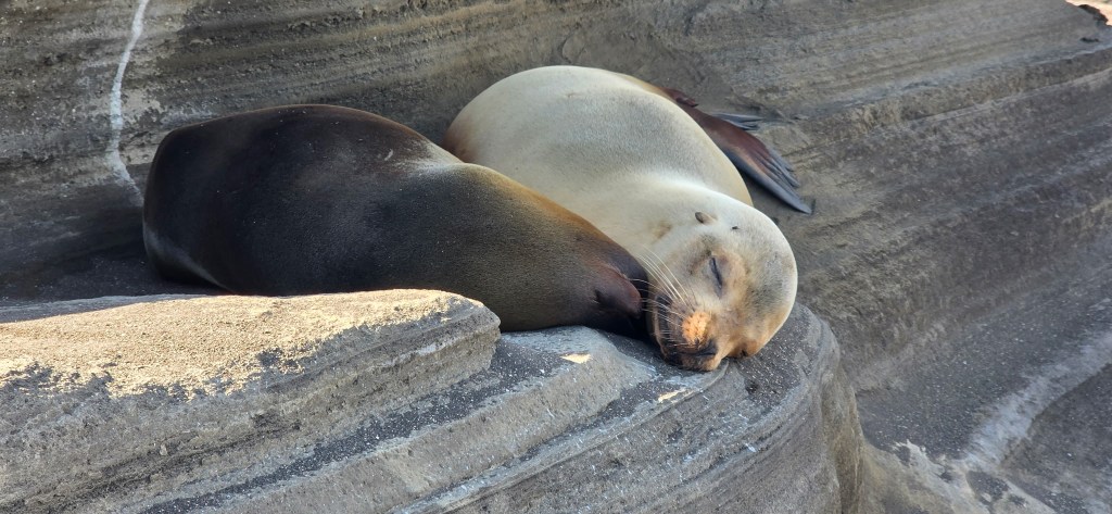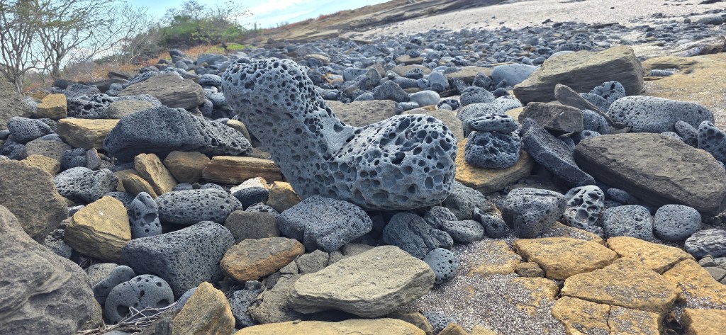 After our hike, we sat on the black sand beach for a bit, chatting with each other. My husband and I heard an interesting bird call and I knew if I talked to the naturalist, Ibari, that he would know what bird it was. I was right! However, he said no one has have recorded that bird being on Santiago Island, but he has also heard ii! I thought that was pretty neat. The bird was a tiny one that was red and black.