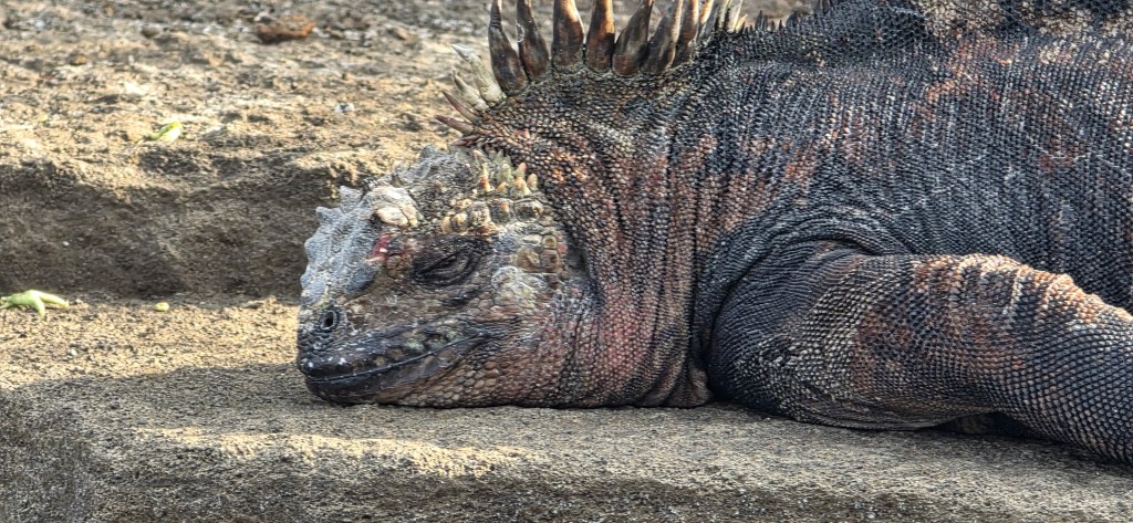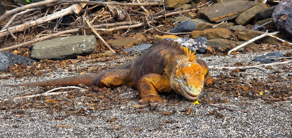 Santiago island was once overrun with goats. They ate everything and the land iguanas all died of starvation. They decided to get rid of all the goats. How did they do this? They put a collar on a female goat and all the other goats followed her so they could shoot all the goats from a helicopter. Yes, they ate the goats. Now they have re-introduced land iguanas.